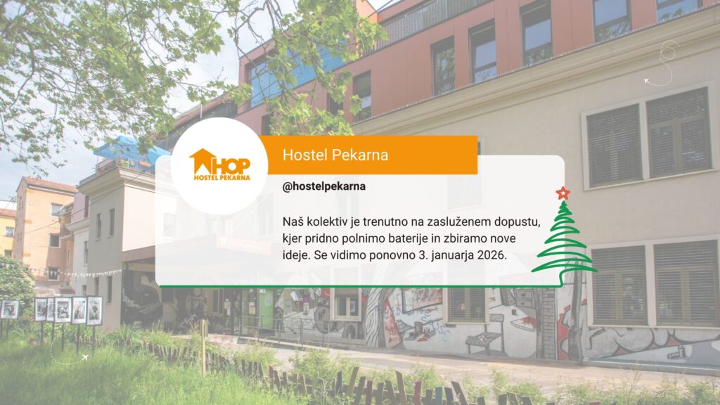 Kolektiv Hostla Pekarna je med 25. decembrom 2025 in 2. januarjem 2026 zaradi praznikov in kolektivnega dopusta zaprt. Na recepcijo in za zaslone se vračamo v soboto, 3. januarja 2026.